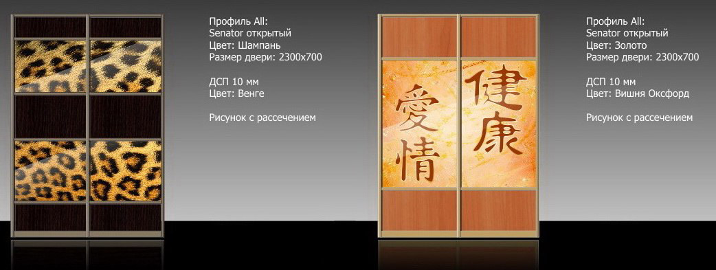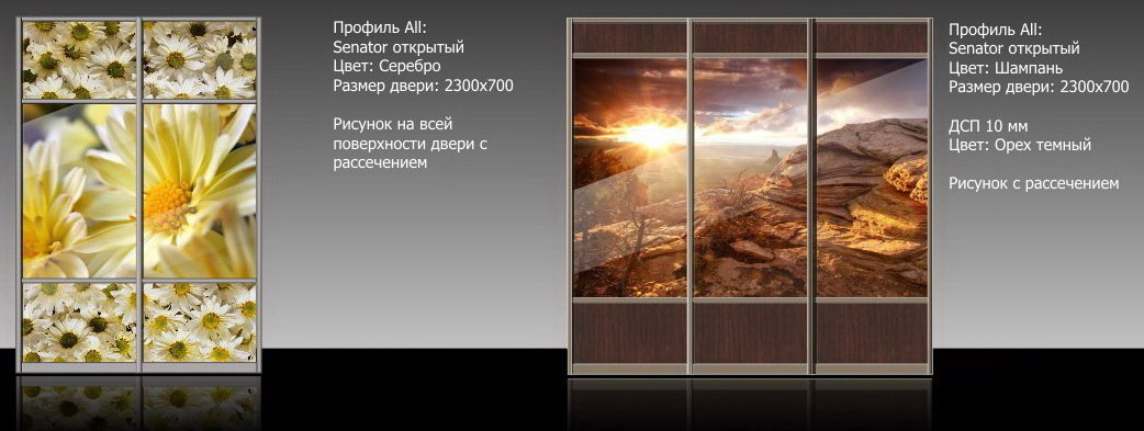 - Фотопечать. С развитием рекламной индустрии технологии широкоформатной печати высокого качества нашли применение во многих других сферах и направлениях. Не так давно, не белее 5 лет назад, на отечественном рынке появилась новинка в производстве дверей-купе - использование фотопечати. Фотопечать рисунка или фотографии — залог нестандартных решений для самых разнообразных помещений, начиная от офиса или квартиры и заканчивая торговым залом или коттеджем. Современные двери-купе с необычным изображением будут ключевым акцентом интерьера, создавая особое настроение у хозяев дома и их гостей. Такой вид декора шкафов является отличной заменой фрескам, которые стоят значительно дороже, а по внешнему виду выигрывают лишь чуть-чуть. Мы предлагаем безграничное поле для вашей фантазии: вы можете выбрать одно из изображений нашего каталога (более 3500 вариантов) или заказать собственный рисунок или фотографию. Любое изображение может украсить ваш дом!