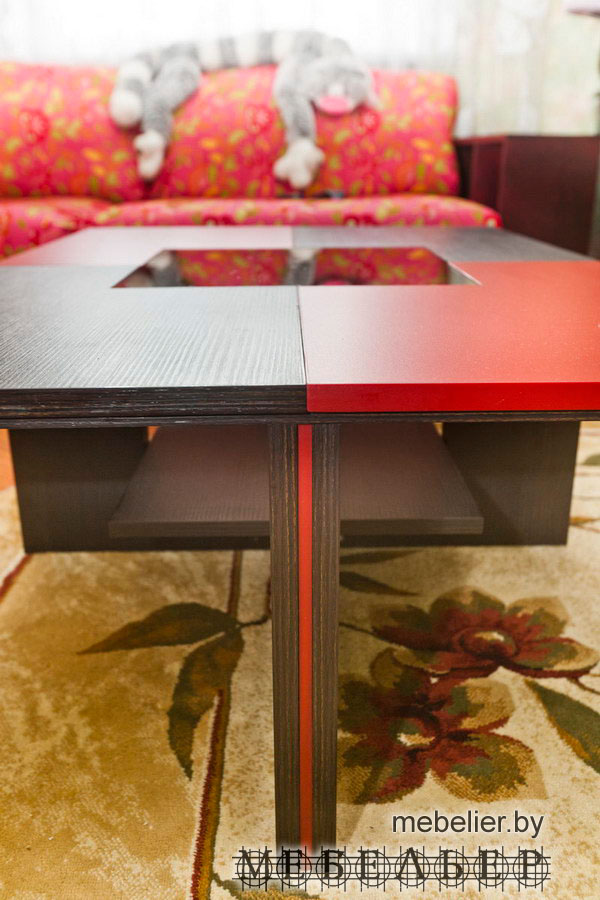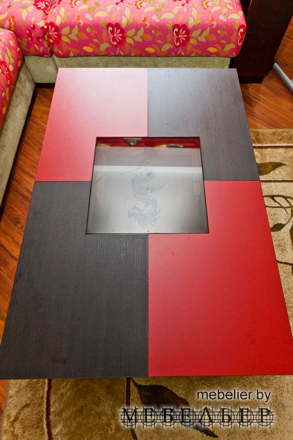 Журнальный столик в том же стиле (возможно исполнение с светодиодной подсветкой). Нижняя полочка для газет и журналов разгружает рабочую поверхность, стекло с пескоструйным рисунком позволяет легко взять нужный журнал не заглядывая под столик сбоку. Удобно для чтения и ужина перед TV экраном.